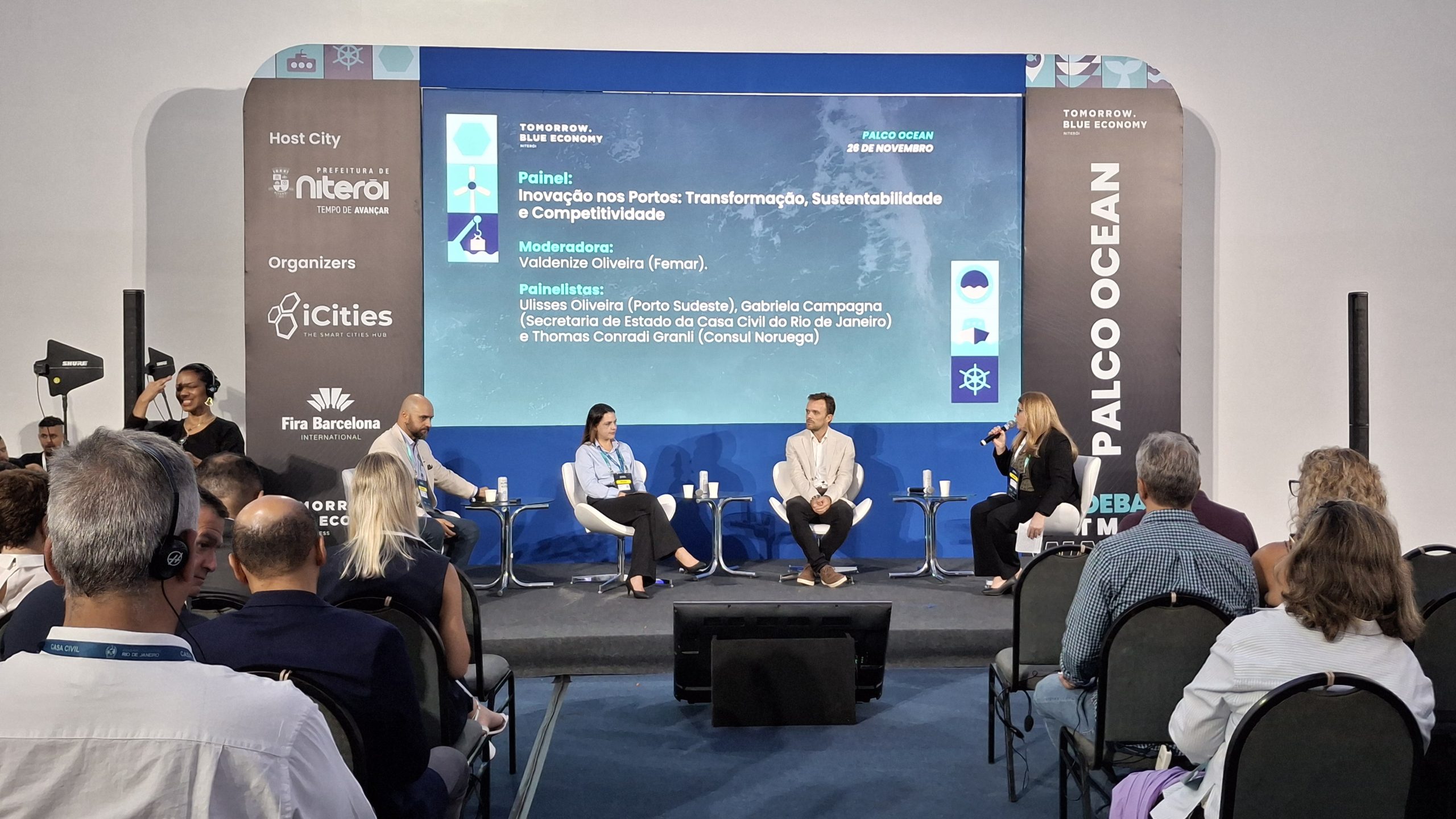 A Prof.ª Valdenize Pereira de Oliveira, da FEMAR, foi moderadora do painel “Inovação nos Portos: Transformação, Sustentabilidade e Competitividade”, que reuniu Thomas Conradi Granli (Innovation Norway), Gabriela Campagna (Secretaria de Estado da Casa Civil do RJ) e Ulisses Oliveira (Porto Sudeste). O debate abordou o momento de transformação vivido pelos portos, impulsionado por exigências econômicas e ambientais. Os especialistas destacaram como a inovação vem modernizando a gestão portuária, trazendo eficiência, integração entre setores e novas práticas que fortalecem os portos como motores do desenvolvimento regional e global.